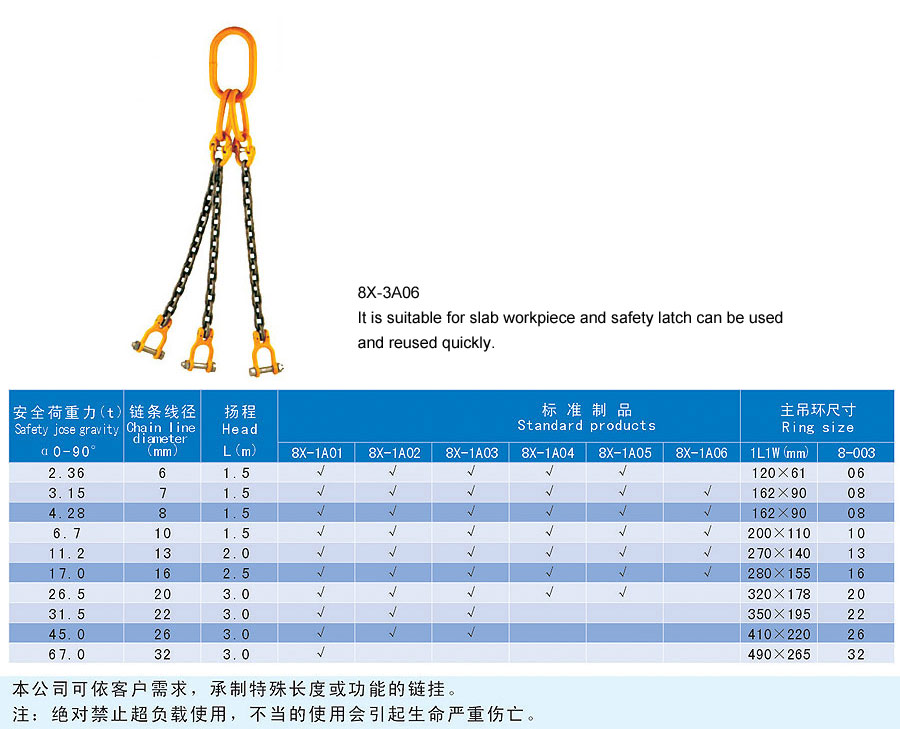 Chain rigging is a kind of rigging formed by connecting metallic chain links, which is divided into two categories in form, namely welding type and assembling type and falls into single foot and multi-feet in structure. The chain rigging is made of high quality alloy steel, boasts wear resistance, high strength, durability and flexibility and is suitable for large scale and frequent usage. Additionally, it is anti-radiation and high temperature(-40~200℃) and is suitable for lifting hot steel billet and steel coil. The flexible multiple feet and various combinations can improve efficiency and cut cost. The company offers general types of ship store, accessories and marine spare supply and technical services and it aims to provide best products and services for our customers.