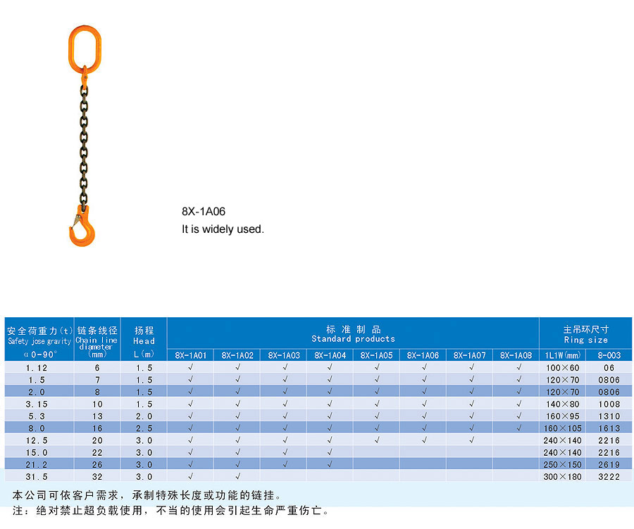 Chain rigging is a kind of rigging formed by connecting metallic chain links, which is divided into two categories in form, namely welding type and assembling type and falls into single foot and multi-feet in structure. The chain rigging is made of high quality alloy steel, boasts wear resistance, high strength, durability and flexibility and is suitable for large scale and frequent usage. Additionally, it is anti-radiation and high temperature(-40~200℃) and is suitable for lifting hot steel billet and steel coil. The flexible multiple feet and various combinations can improve efficiency and cut cost. The company offers general types of ship store, accessories and marine spare supply and technical services and it aims to provide best products and services for our customers.