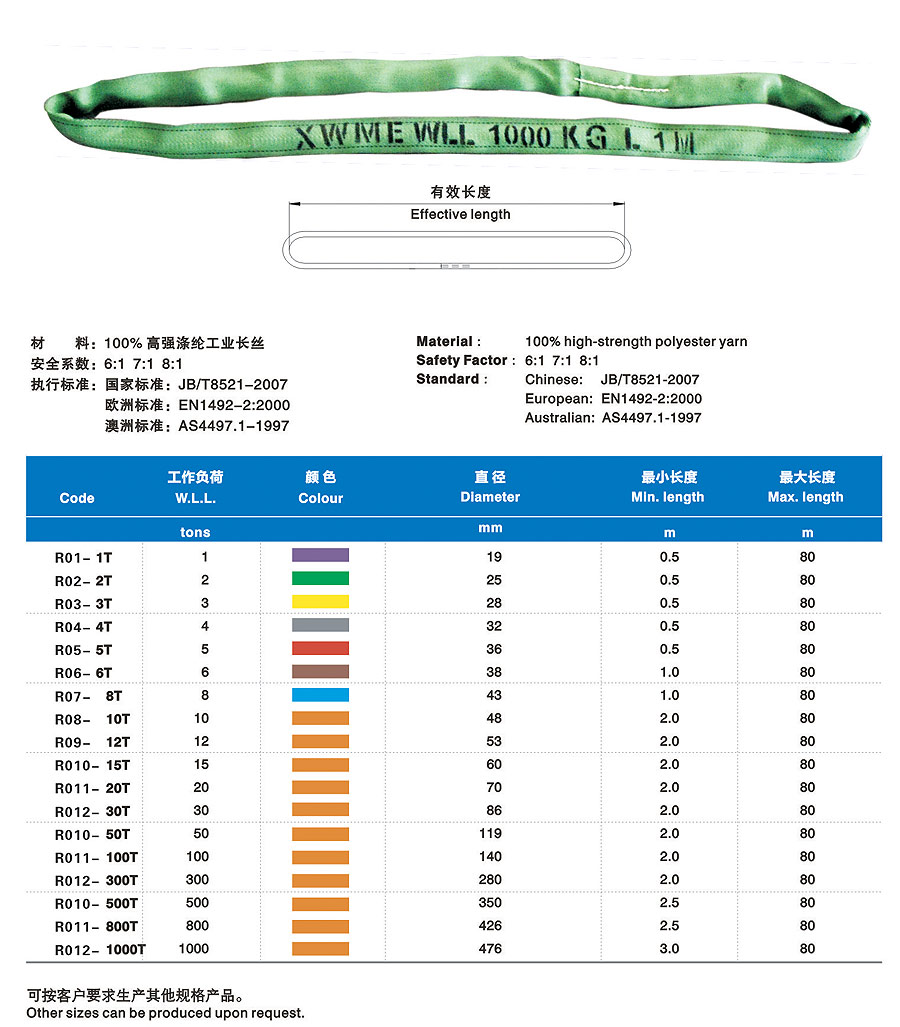 合成纖維吊裝帶(以下簡稱吊裝帶)為軟吊裝帶,采用非金屬原料,屬吊裝行業(yè)中鋼繩、鏈條的換代產(chǎn)品,比同類金屬繩相對輕便。能解決實際吊裝過程中大噸位、小吊裝空間的吊裝難題。吊裝帶有輕便、使用壽命長、減震性能好、不導(dǎo)電、不易腐蝕、保護(hù)被吊物品不被刮傷等特點。多次的斷裂試驗表明,吊裝帶相對于金屬繩鏈產(chǎn)生的反向傷害幾乎為零。吊裝帶采用國際標(biāo)準(zhǔn)色來區(qū)分承載噸位,在使用過程中,吊帶裝上的標(biāo)簽?zāi)p后,可能過吊裝帶外套的顏色來識別承重重量。合成纖維吊裝帶在國際上起步較早,至今已有著五十多年的應(yīng)用歷史,在經(jīng)過二十多年的國內(nèi)推廣應(yīng)用,以其獨有的顯著優(yōu)勢,早許多行業(yè)正逐步替代鋼絲繩索具和鏈條索具。